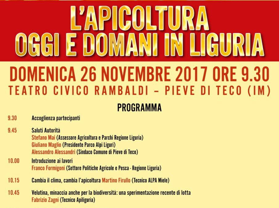 Domenica 26 novembre alle ore 9:30, presso il Teatro Civico Rambaldi di Pieve di Teco (IM) in Valle Arroscia, si terrà il convegno finale di premiazione dell’edizione 2017 del Concorso “Mieli dei Parchi della Liguria”, dedicato agli apicoltori con apiari situati sul territorio dei Comuni facenti parte delle aree protette liguri.
