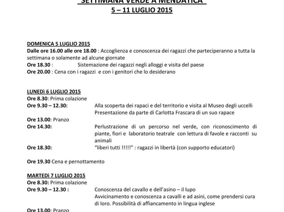 Da Domenica 5 a Sabato 11 luglio Mendatica sarà protagonista nella formazione per i ragazzi con una Settimana Verde per ragazzi dai 6 ai 14 anni: uscite sul territorio, laboratori ed escursioni alla scoperta della natura e degli animali guideranno i giovani alla scoperta della montagna e delle Alpi Liguri, con la sua flora, la fauna (il lupo, i rapaci, gli animali da lavoro) e le vie d’acqua. Il tutto alla presenza di esperti ed educatori.